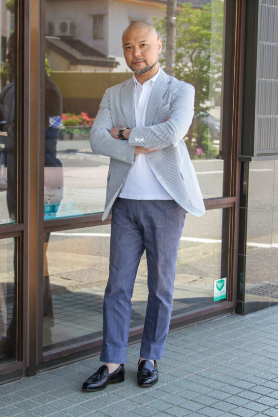自分が思う「大人が似合うアンコンジャケット」を型に落とし込み、暑い日にもTシャツの上からストレスなく羽織れるよう、いかに“軽く”できるかにポイントを絞りました。こちらのジャケット用に、麻、シアサッカー、コードレーン、デニムなどすべて200g/㎡台のライトウェイトな生地を用意しました。