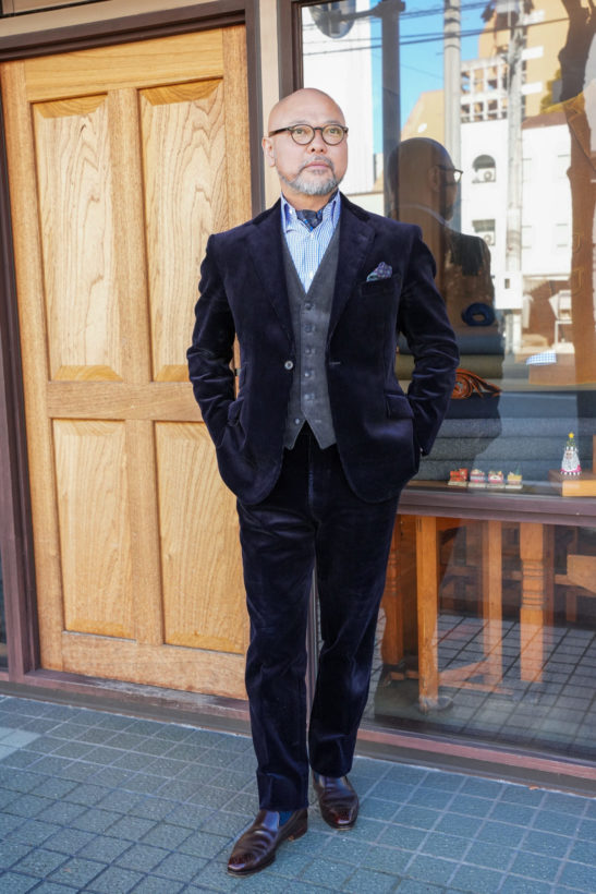 今日は、同じくBrisbane mossのナポリベルベットのウエストコートをインナーに添えてみました。3ピースで仕立てるのも良いですが、オッドベストをインナーに入れて、ワンランク上のおしゃれを楽しんでみるのも良いのではないでしょうか。